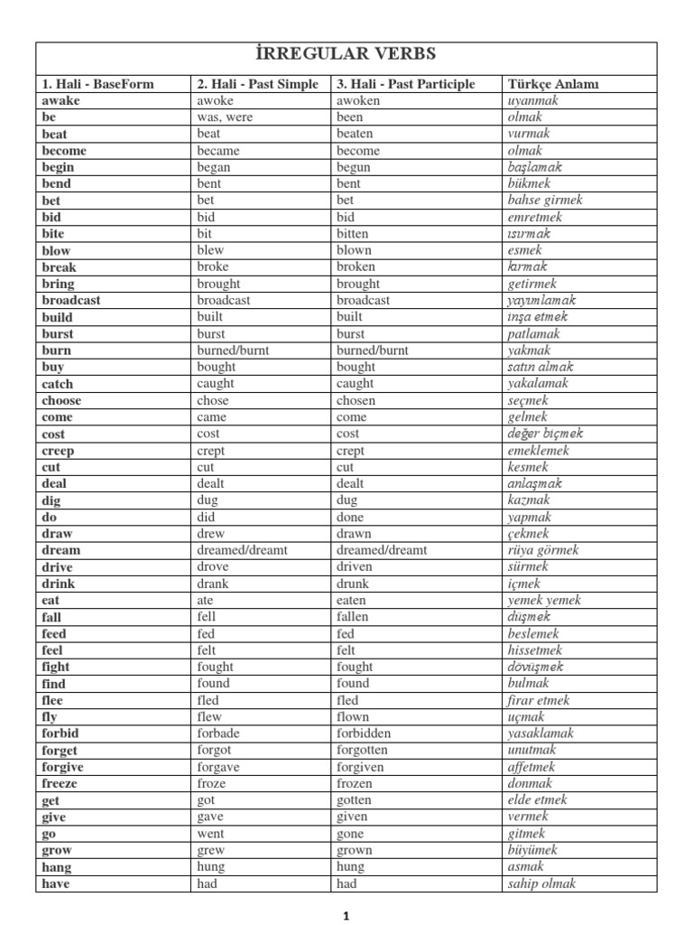 Irregular Verbs Duzensiz Fiiler
